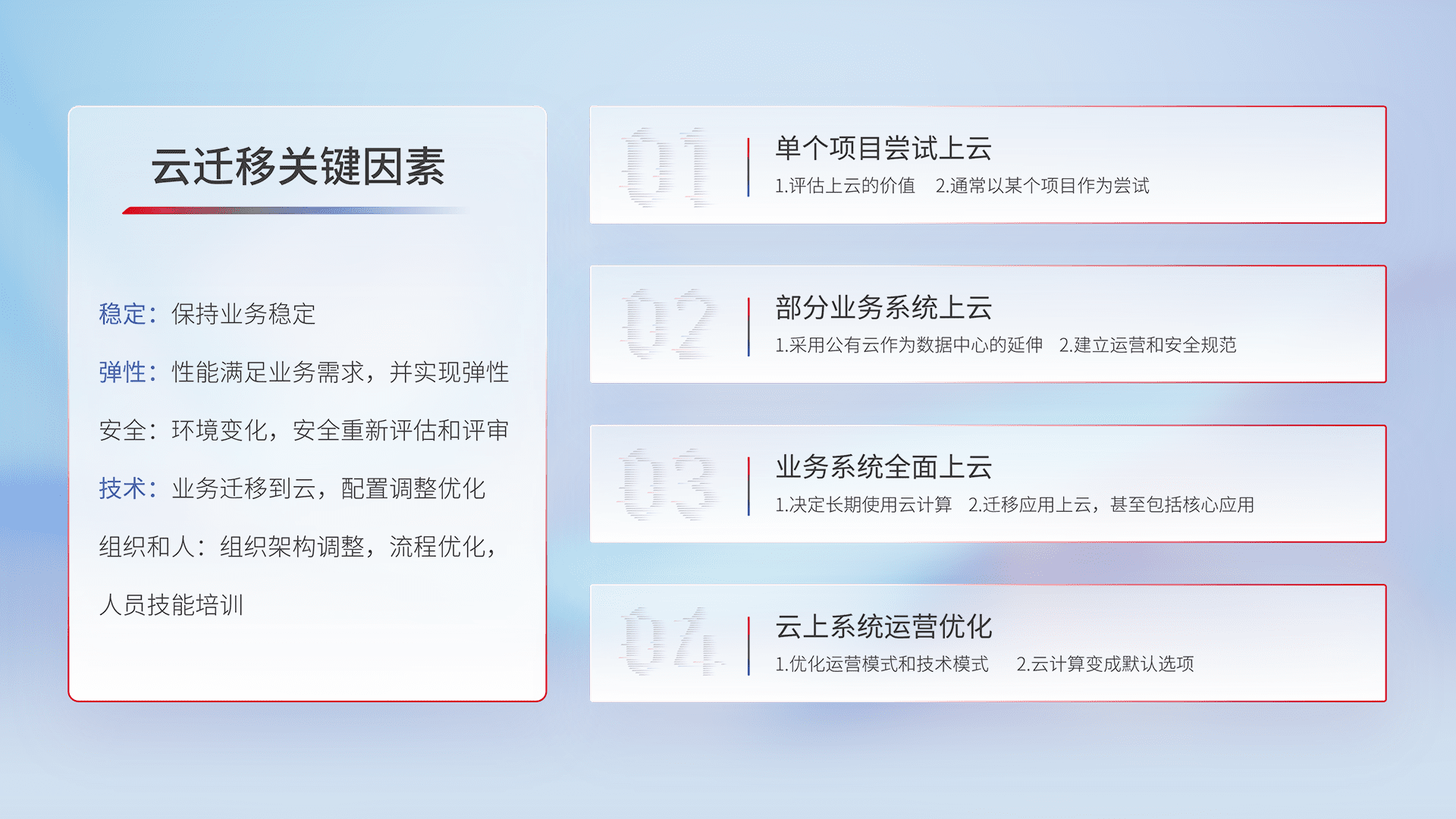结合实际业务,,从规划设计、、、、云平台选型、、、、云原生改造、、数据迁移、、集成交付,,,迁移全过程为客户识别最佳上云路径,,做好风险识别管理,,,,设计网络架构、、、、身份权限、、、安全审计合规、、、、操作审计、、日志审计、、监控告警策略、、、多站点容灾设计等,,,对云上基础设施进行整体规划,,,,提升IT治理水平,,,以满足弹性、、、高可用、、高性能的需求。。。。
