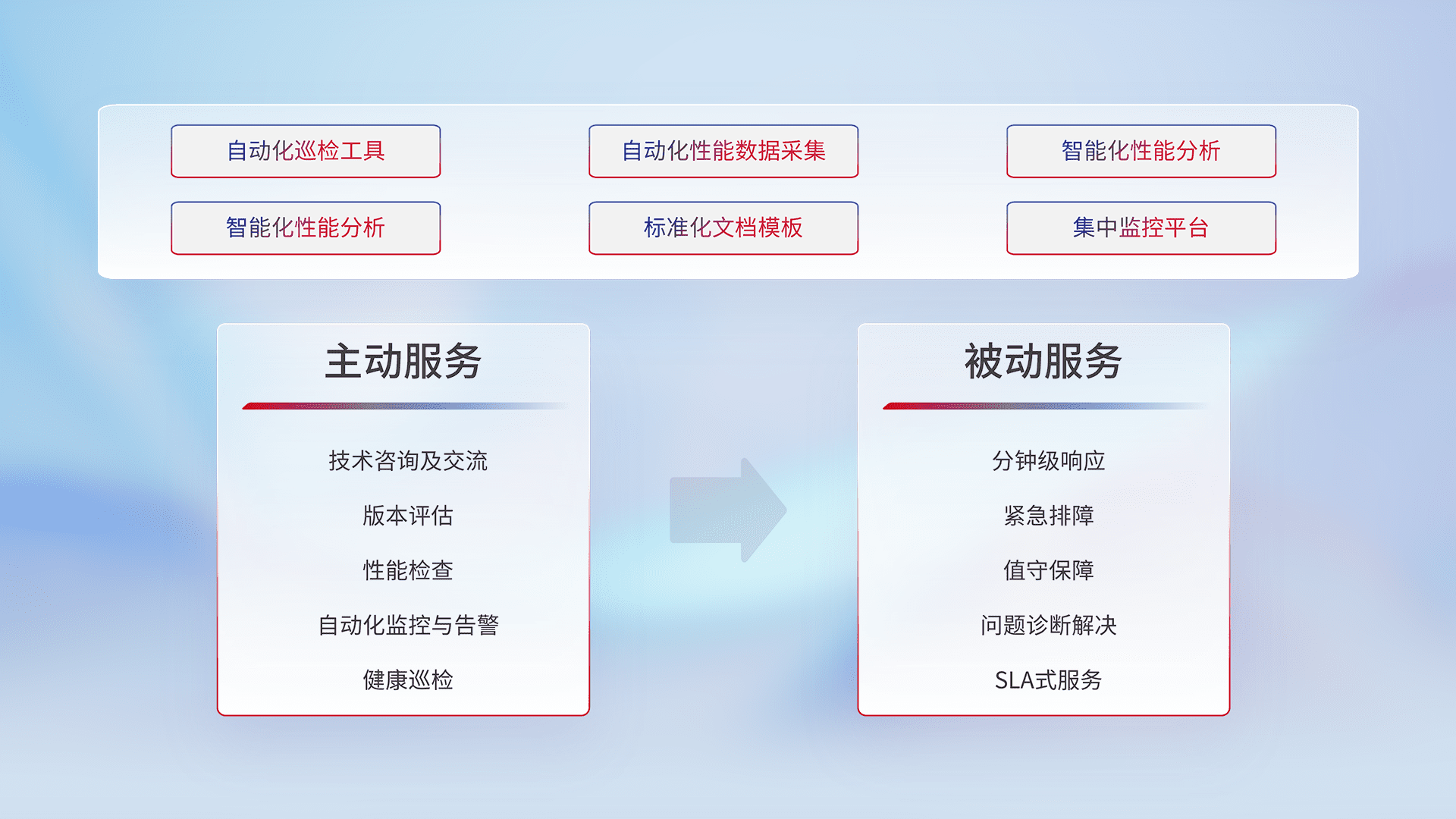 智能化工具和标准化文档,,,,保障服务质量,,提供主动服务(包含技术咨询、、版本评估、、性能检查、、、、自动化监控与告警、、、健康巡检)和被动服务包含(分钟级响应、、、紧急排障、、、、值守保障、、问题诊断解决、、、SLA服务)。。。。